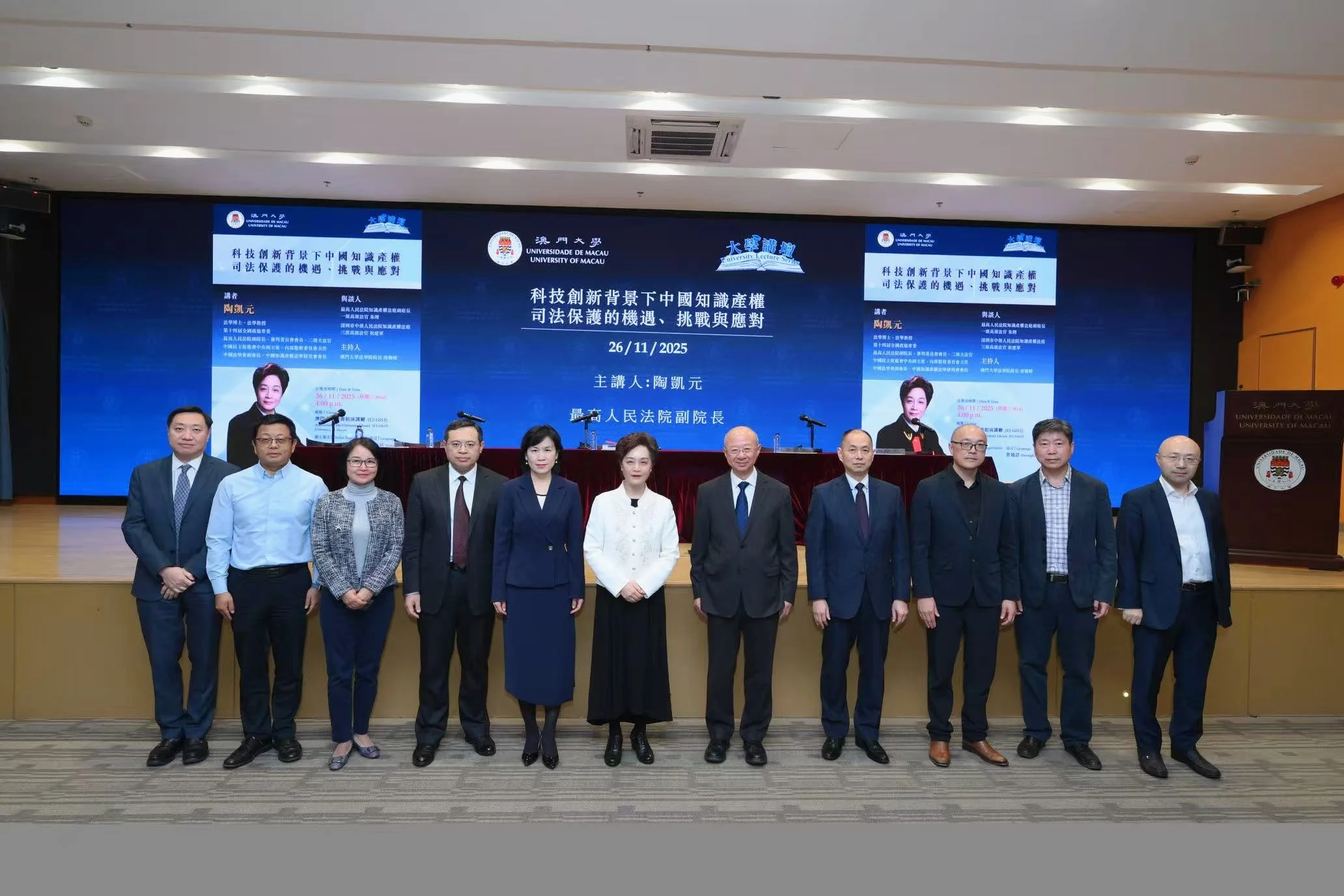 澳門大學於11月26日舉行“大學講壇”,由最高人民法院副院長、二級大法官陶凱元以“科技創新背景下中國知識產權司法保護的機遇、挑戰與應對”為題發表演說,深入探討中國知識產權司法保護的新形勢、新任務及司法應對,吸引澳門社會各界參與。 澳大副校 ...