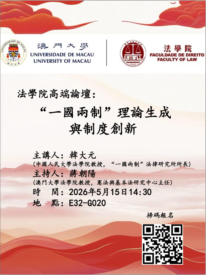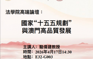 法學院高端論壇:國家“十五五規劃”與澳門高品質發展 Gallery 法學院高端論壇:國家“十五五規劃”與澳門高品質發展 Seminar, 活動 法學院高端論壇:國家“十五五規劃”與澳門高品質發展 3 月 25 | 週三 ...